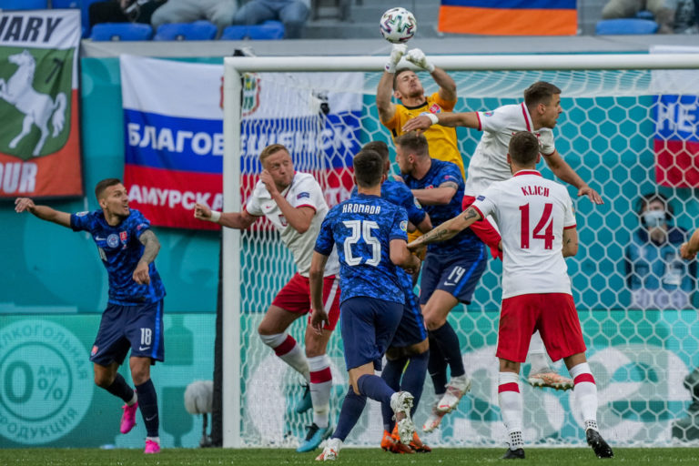 Zákrok slovenského gólmana Martina Dúbravku počas zápasu proti Poľsku na ME vo futbale 2020. Petrohrad, 14. jún 2021. Foto: SITA/AP.