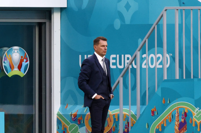 Tréner slovenskej reprezentácie Štefan Tarkovič počas zápasu proti Poľsku na ME vo futbale 2020. Petrohrad, 14. jún 2021. Foto: Jevgenia Novoženina/Pool via AP.