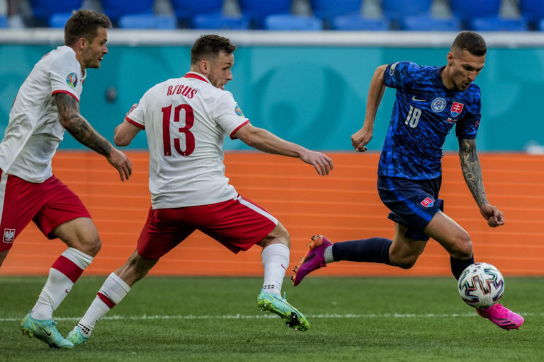 Slovenský reprezentant Lukáš Haraslín v súboji o loptu s Poliakom Karolom Linettym počas zápasu na ME vo futbale 2020. Petrohrad, 14. jún 2021. Foto: Anton Vaganov/Pool via AP.