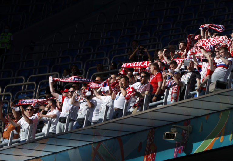 Fanúšikovia počas zápasu Poľsko - Slovensko na ME vo futbale 2020. Petrohrad, 14. jún 2021. Foto: SITA/AP.