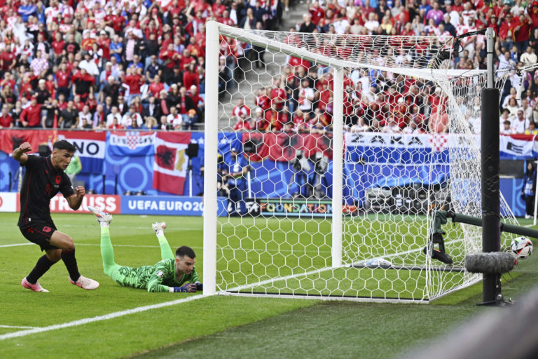 Albánsky reprezentant Qazim Laci prekonáva chorvátskeho brankára Dominika Livakoviča počas zápasu B-skupiny na ME vo futbale 2024. Hamburg, 19. jún 2024. Foto: Sina Schuldt/dpa via AP.