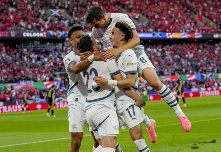 Švajčiar Xherdan Shaqiri sa so spoluhráčmi teší zo svojho gólu v sieti Škótska v zápase A-skupiny na ME vo futbale 2024. Kolín nad Rýnom, 19. jún 2024. Foto: SITA/AP.