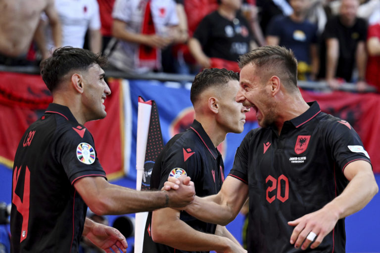 Albánsky reprezentant Qazim Laci sa teší z gólu v sieti Chorvátska v zápase B-skupiny na ME vo futbale 2024. Hamburg, 19. jún 2024. Foto: Sina Schuldt/dpa via AP.