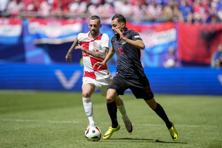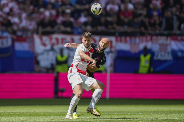 Albánsky reprezentant Nedim Bajrami v súboji s Chorvátom Marcelom Brozovičom počas zápasu B-skupiny na ME vo futbale 2024. Hamburg, 19. jún 2204. Foto: SITA/AP.