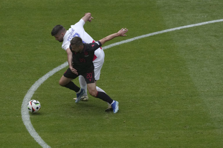Chorvát Mateo Kovacič padá po súboji s albánskym reprezentantom Qazim Lacim počas zápasu B-skupiny na ME vo futbale 2024. Hamburg, 19. jún 2204. Foto: SITA/AP.
