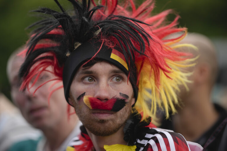 Fanúšik Nemecka sleduje zápas skupiny A na ME vo futbale 2024 proti Maďarsku v berlínskej fan zóne. Berlín, 19. jún 2024. Foto: SITA/AP