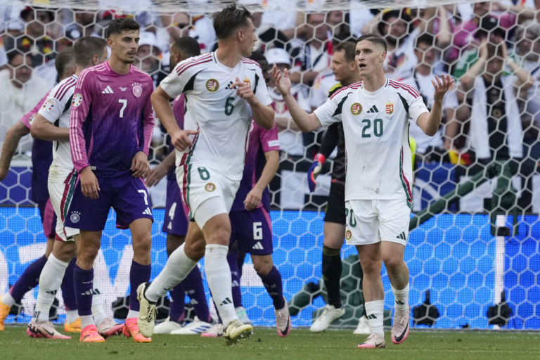 Sklamaný Roland Sallai z Maďarska (vpravo) po neuznanom góle do siete Nemecka počas zápasu skupiny A na ME vo futbale 2024. Stuttgart, 19. júna 2024. Foto: SITA/AP