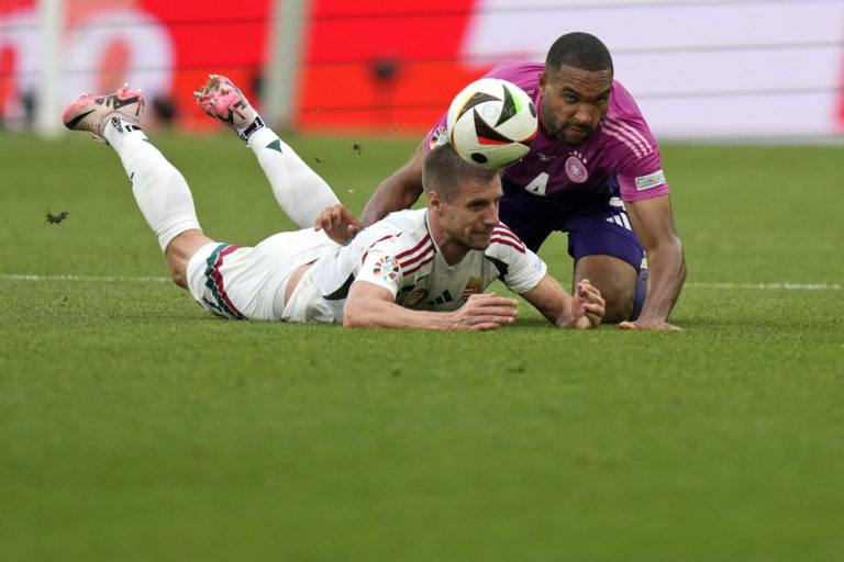 Jonathan Tah z Nemecka (vpravo) a Barnabás Varga z Maďarska v súboji o loptu počas zápasu skupiny A na ME vo futbale 2024. Stuttgart, 19. jún 2024. Foto: SITA/AP