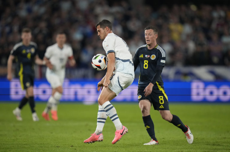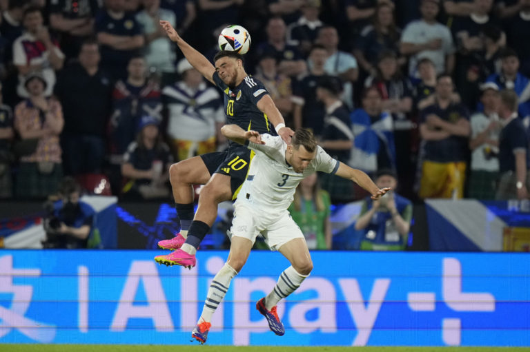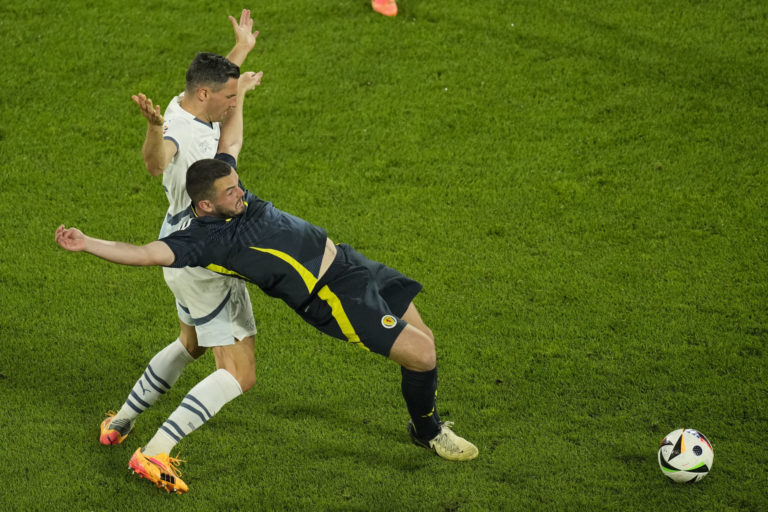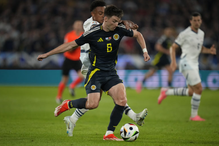 Švajčiarsky reprezetant Ricardo Rodriguez sa snaží zastaviť Škóta Billyho Gilmoura v zápase základnej A-skupiny na ME vo futbale 2024. Kolín nad Rýnom, 19. jún 2024. Foto: Marius Becker/dpa via AP.