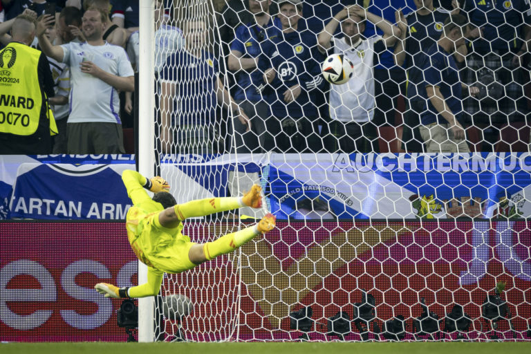 Gól švajčiarskeho reprezentanta Xherdana Shaqiriho v zápase proti Škótsku v základnej A-skupine na ME vo futbale 2024. Kolín nad Rýnom, 19. jún 2024. Foto: Peter Klaunzer/Keystone via AP.