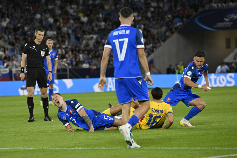Zľava: Martin Sviderský zo Slovenska (uprostred) počas zápasu A-skupiny 25. majstrovstiev Európy 2025 vo futbale hráčov do 21 rokov EURO U21 2025 medzi Slovensko - Rumunsko. Bratislava, 17. jún 2025. Foto: SITA/Milan Illík.