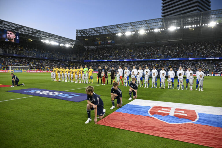 Nastúpení hráči pred zápasom A-skupiny 25. majstrovstiev Európy 2025 vo futbale hráčov do 21 rokov EURO U21 2025 medzi Slovensko - Rumunsko. Bratislava, 17. jún 2025. Foto: SITA/Milan Illík.