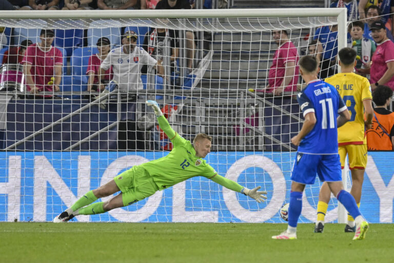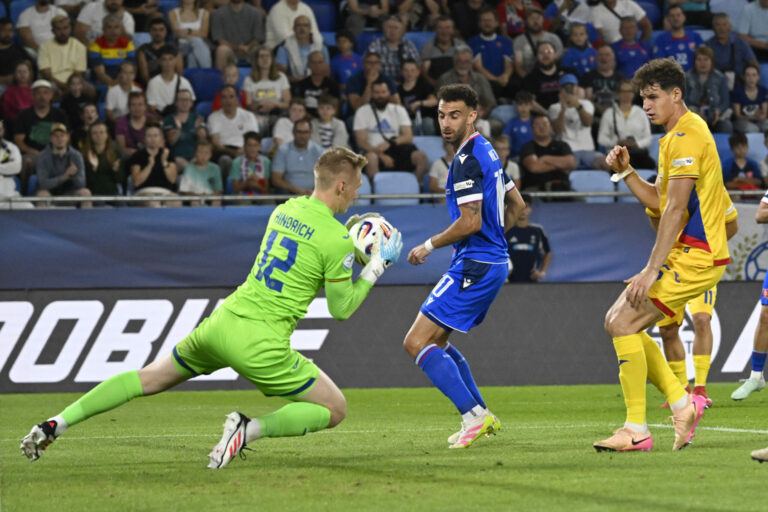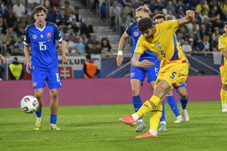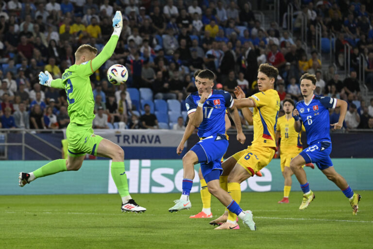 Umit Akdag z Rumunska strieľa gól 2-1 počas zápasu A-skupiny 25. majstrovstiev Európy 2025 vo futbale hráčov do 21 rokov EURO U21 2025 medzi Slovensko - Rumunsko. Bratislava, 17. jún 2025. Foto: SITA/Milan Illík.