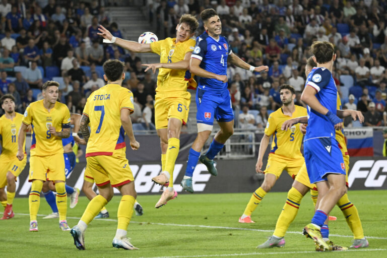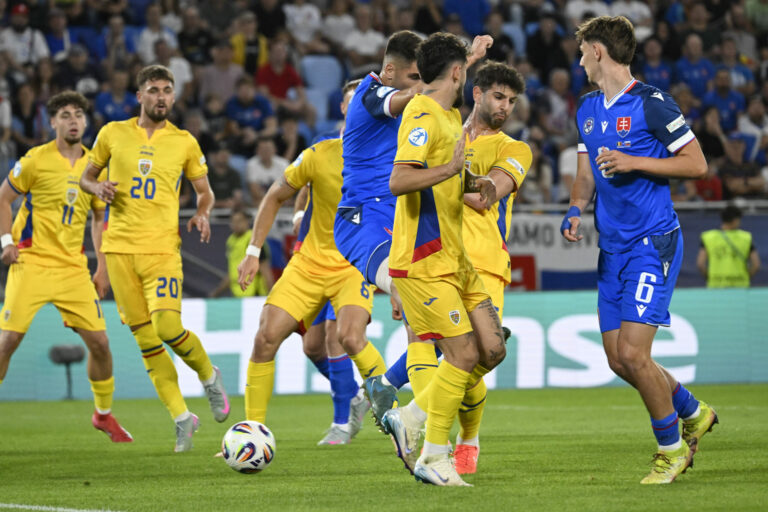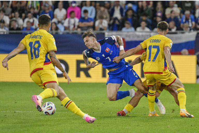Zľava: Tony Strata z Rumunska, Tomáš Suslov zo Slovenska a Ianis Stoica počas zápasu A-skupiny 25. majstrovstiev Európy 2025 vo futbale hráčov do 21 rokov EURO U21 2025 medzi Slovensko - Rumunsko. Bratislava, 17. jún 2025. Foto: SITA/Milan Illík.