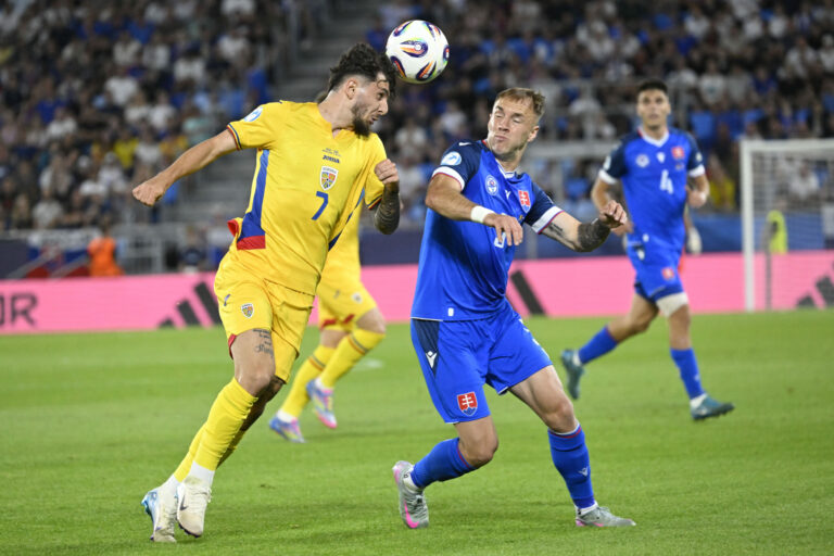 Zľava: Otto Hindrich z Rumunska a Sebastián Nebyla zo Slovenska počas zápasu A-skupiny 25. majstrovstiev Európy 2025 vo futbale hráčov do 21 rokov EURO U21 2025 medzi Slovensko - Rumunsko. Bratislava, 17. jún 2025. Foto: SITA/Milan Illík.