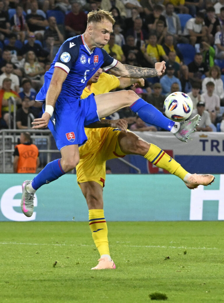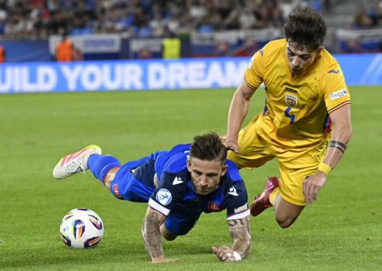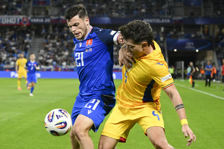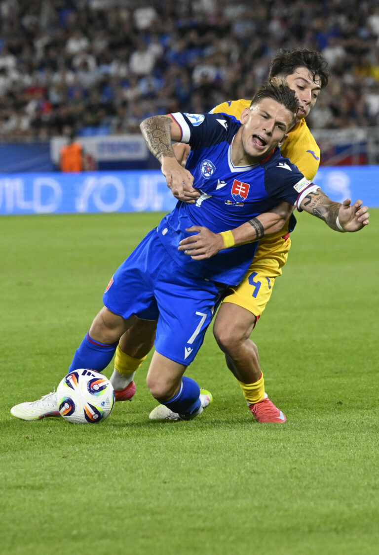 Zľava: Samuel Kopásek zo Slovenska a Costin Amzar z Rumunska počas zápasu A-skupiny 25. majstrovstiev Európy 2025 vo futbale hráčov do 21 rokov EURO U21 2025 medzi Slovensko - Rumunsko. Bratislava, 17. jún 2025. Foto: SITA/Milan Illík.