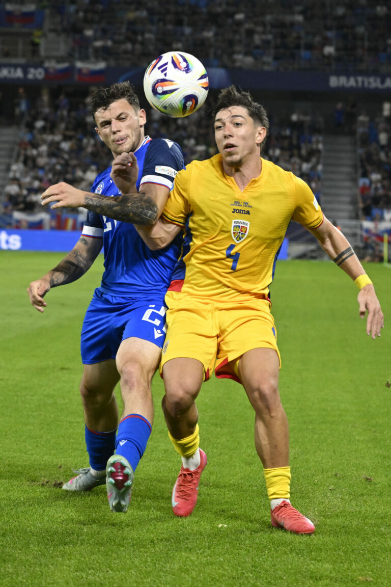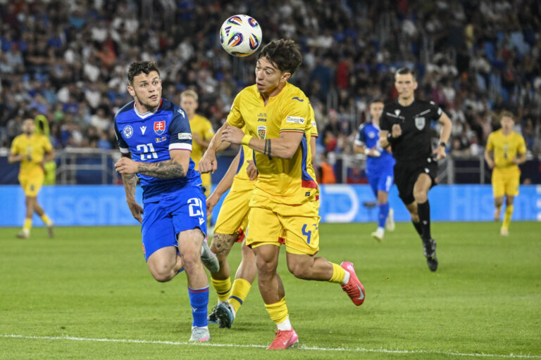 Sprava v popredí: Costin Amzar z Rumunska a Samuel Kopásek zo Slovenska počas zápasu A-skupiny 25. majstrovstiev Európy 2025 vo futbale hráčov do 21 rokov EURO U21 2025 medzi Slovensko - Rumunsko. Bratislava, 17. jún 2025. Foto: SITA/Milan Illík.