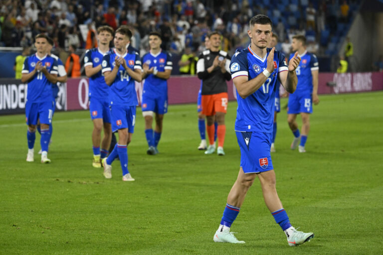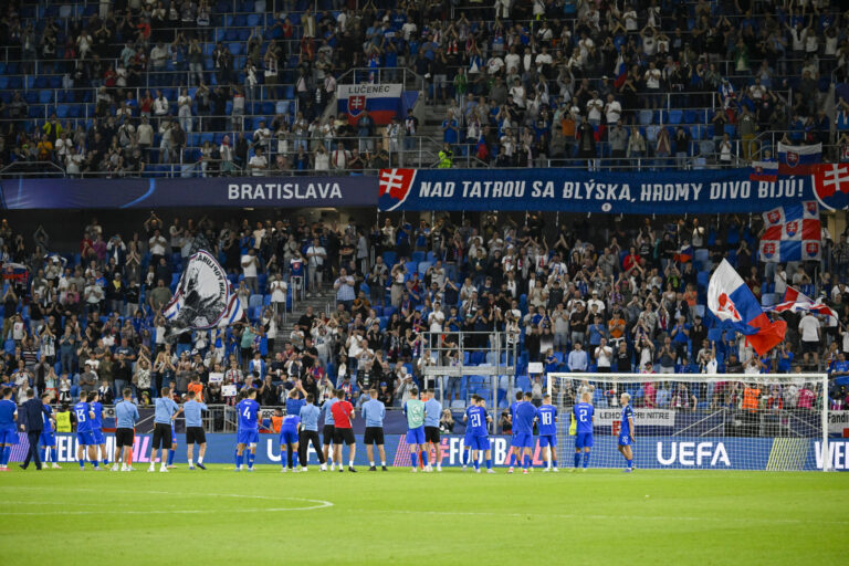 Hráči zo Slovenska ďakujú divákom po zápase A-skupiny 25. majstrovstiev Európy 2025 vo futbale hráčov do 21 rokov EURO U21 2025 medzi Slovensko - Rumunsko. Bratislava, 17. jún 2025. Foto: SITA/Milan Illík.