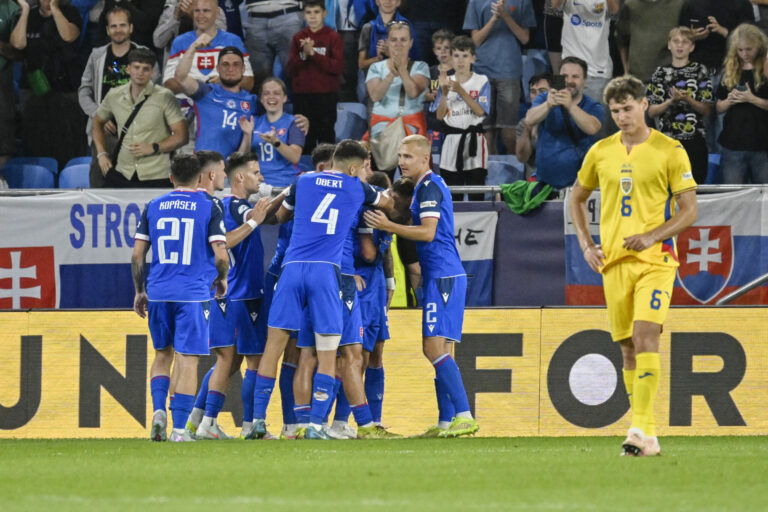 Hráči zo Slovenska sa tešia po góle 1-0 počas zápasu A-skupiny 25. majstrovstiev Európy 2025 vo futbale hráčov do 21 rokov EURO U21 2025 medzi Slovensko - Rumunsko. Bratislava, 17. jún 2025. Foto: SITA/Milan Illík.