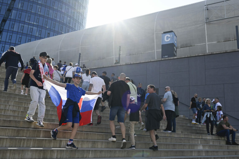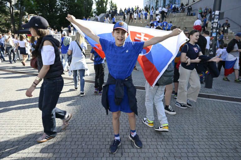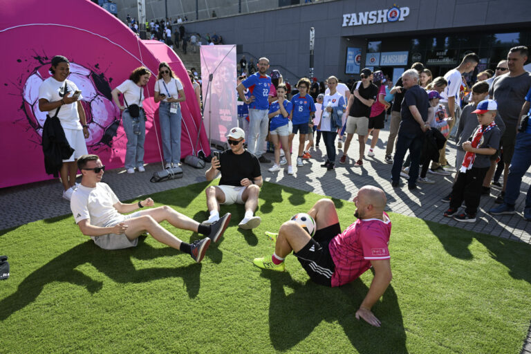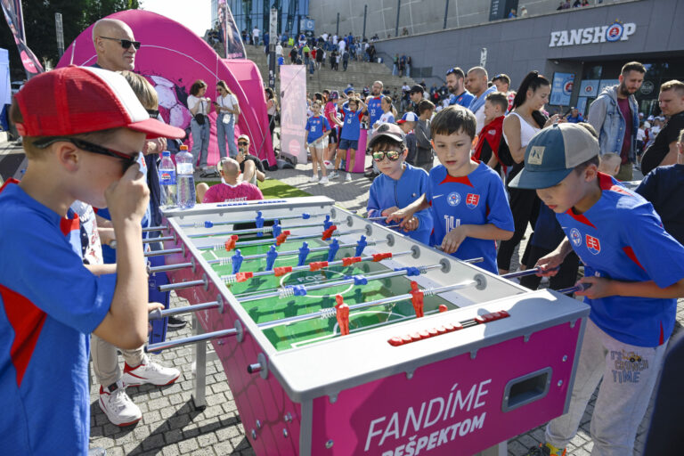 Fanúšikovia vo fanzóne pred Národným futbalovým štadiónom v Bratislave pred zápasom A-skupiny 25. majstrovstiev Európy vo futbale hráčov do 21 rokov (EURO U21 2025) medzi Slovensko - Španielsko. Bratislava, 11. jún 2025. Foto: SITA/Milan Illík