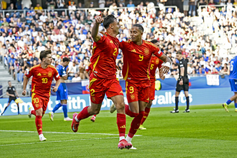 Španiel Marc Pubill (s číslom 2) sa so spoluhráčom Mateom Josephom teší z svojho gólu na 1:0 v zápase proti Slovensku v základnej A-skupine na ME vo futbale 2025. Bratislava (Národný futbalový štadión), 11. jún 2025. Foto: SITA/Milan Illík.