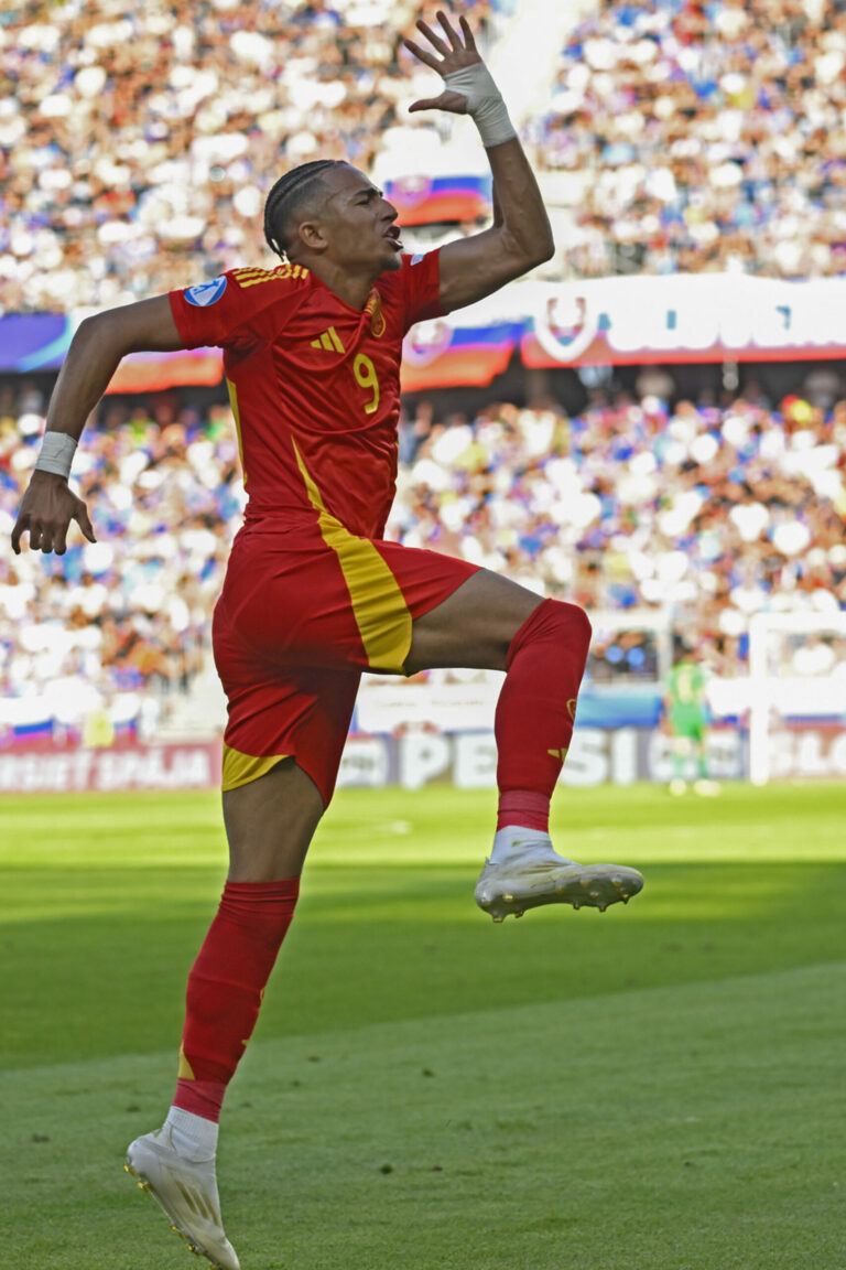 Španiel Mateo Joseph sa teší zo svojho gólu na 2:0 v zápase proti Slovensku v základnej A-skupine na ME vo futbale do 21 rokov. Bratislava (Národný futbalový štadión), 11. jún 2025. Foto: SITA/Milan Illík.