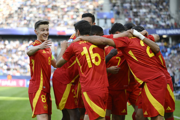 Radosť Španielov po góle na 2:0 v zápase proti Slovensku v základnej A-skupine na ME vo futbale do 21 rokov. Bratislava (Národný futbalový štadión), 11 jún 2025. Foto: SITA/Milan Illík.