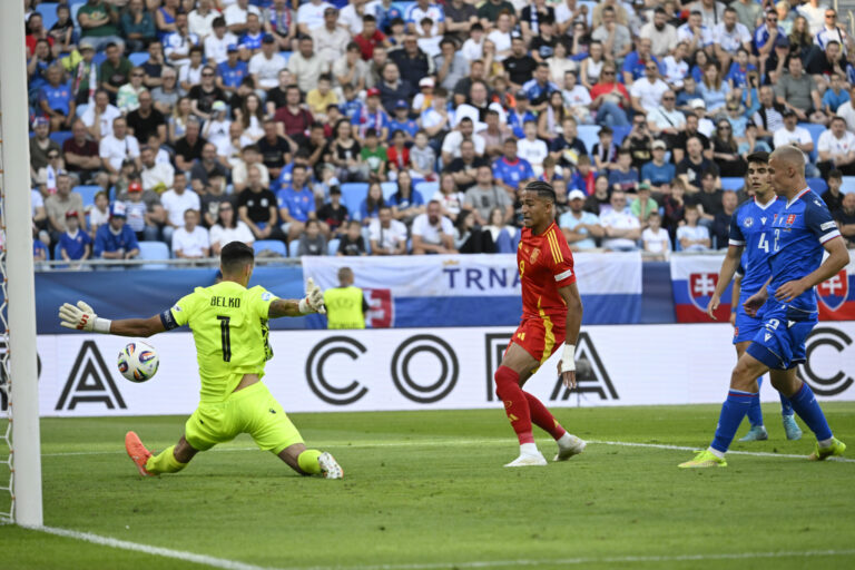 Gól španielskeho reprezentanta Marca Pubilla na 1:0 v zápase proti Slovensku na ME vo futbale do 21 rokov. Bratislava (Národný futbalový štadión), 11. jún 2025. Foto: SITA/Milan Illík.