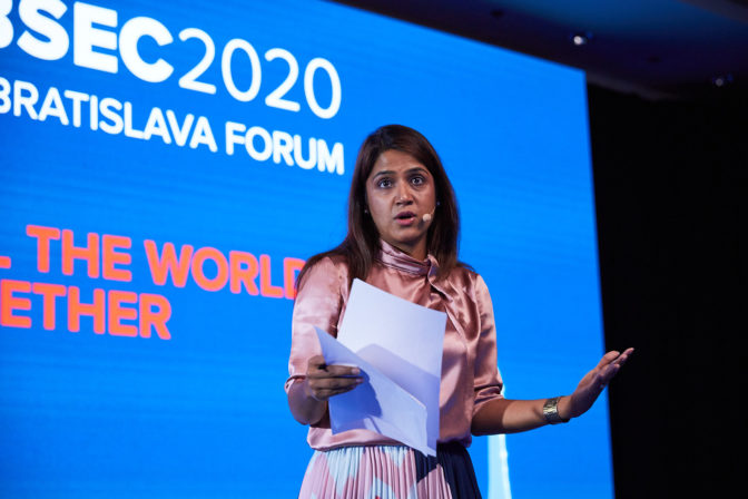 Reportérka, moderátorka a zakľadateľka spoločnosti Facultas Media Limited Maithreyi Seetharaman počas oficiálneho otvorenia medzinárodnej konferencie Globsec 2021 Bratislava Forum. Bratislava, 15. jún 2021. Foto: SITA/GLOBSEC