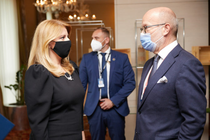 Prezidentka SR Zuzana Čaputová (vľavo) v príhovore počas medzinárodnej konferencie Globsec 2021 Bratislava Forum. Bratislava, 15. jún 2021. Foto: SITA/Alexandra Čunderlíková