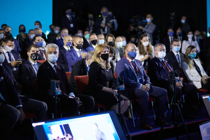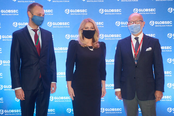 Prezidentka SR Zuzana Čaputová (druhá sprava) počas medzinárodnej konferencie Globsec 2021 Bratislava Forum. Bratislava, 15. jún 2021. Foto: SITA/Alexandra Čunderlíková