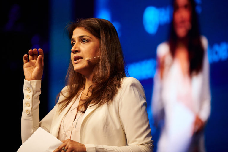 Reportérka, moderátorka a zakľadateľka spoločnosti Facultas Media Limited Maithreyi Seetharaman počas oficiálneho otvorenia medzinárodnej konferencie Globsec 2021 Bratislava Forum. Bratislava, 15. jún 2021. Foto: SITA/GLOBSEC