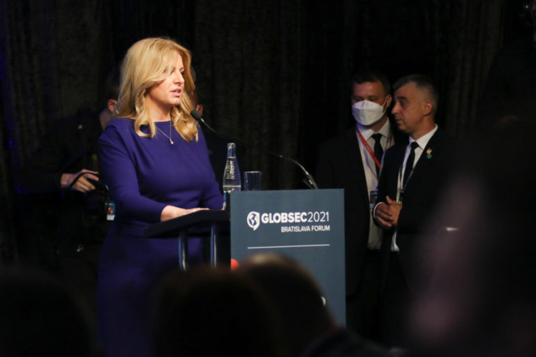 Prezidentka SR Zuzana Čaputová (vľavo) v príhovore počas medzinárodnej konferencie Globsec 2021 Bratislava Forum. Bratislava, 15. jún 2021. Foto: SITA/Alexandra Čunderlíková