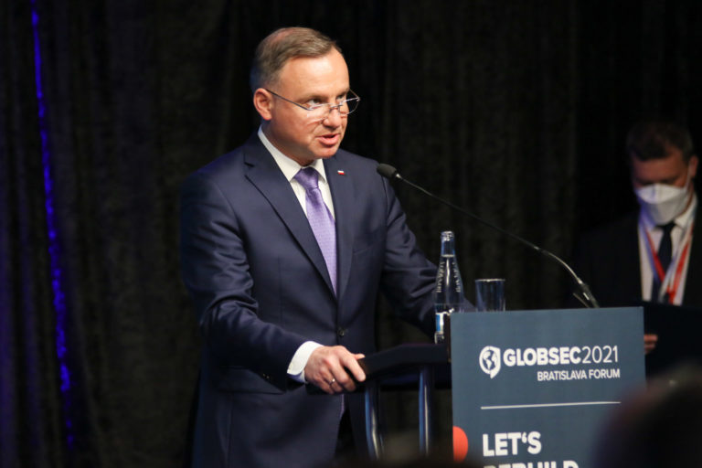 Prezident Poľskej republiky Andrzej Duda v príhovore počas medzinárodnej konferencie Globsec 2021 Bratislava Forum. Bratislava, 15. jún 2021. Foto: SITA/Alexandra Čunderlíková