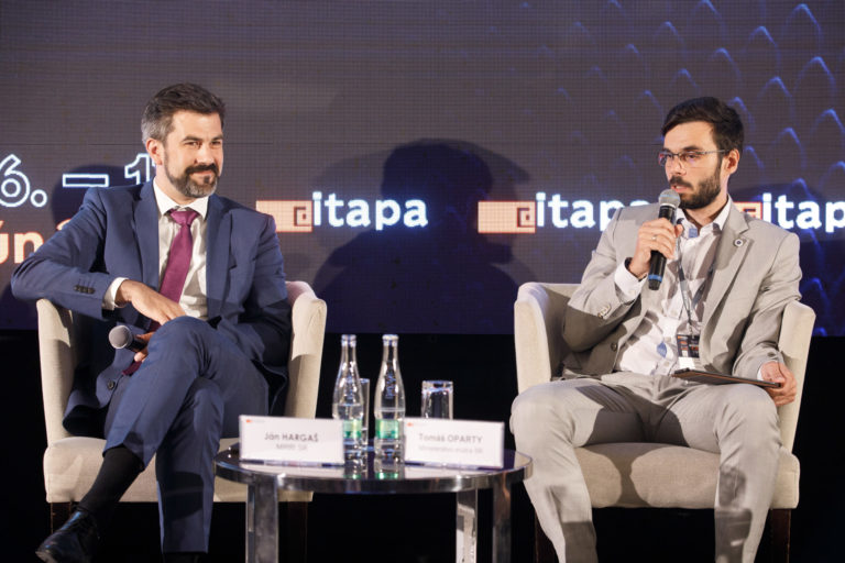 Zľava: Štátny tajomník pre informatizáciu na MIRRI SR Ján Hargaš a štátny tajomník Ministerstva vnútra SR Tomáš Oparty počas diskusie v rámci Medzinárodnej konferencie Jarná ITAPA 2022. Bratislava, 16. jún 2022. Foto: SITA/Branislav Bibel