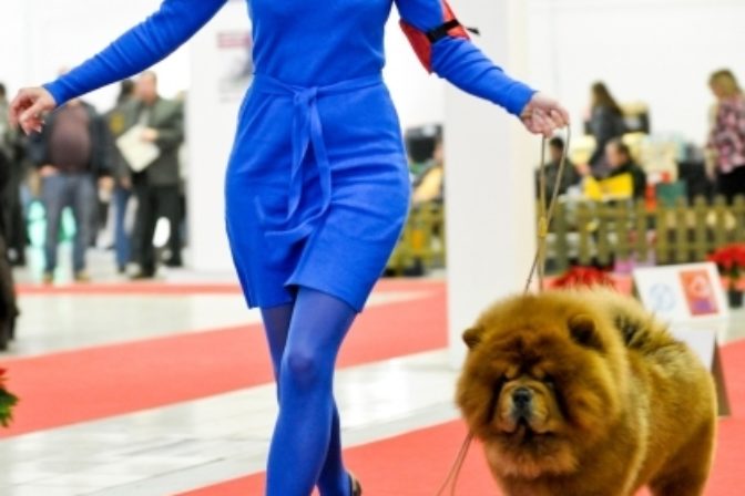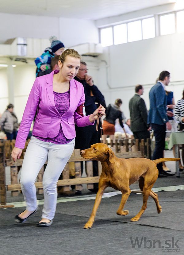 Pes plemena maďarský krátkosrstý stavač (lat. Canis lupus f. familiaris) (vpravo) počas Medzinárodnej výstavy psov 2015 v Nitre. Nitra, 10. január 2015. Foto: SITA/Martin Havran