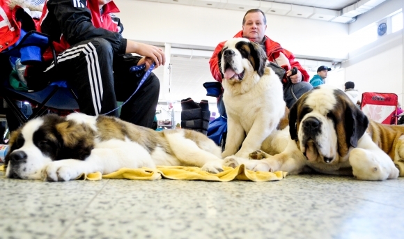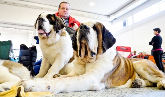 Plemeno psa bernardín (Canis familiaris) počas Medzinárodnej výstavy psov, ktorá sa koná v dňoch 1. a 2. decembra na výstavisku Agrokomplex v Nitre. Foto: SITA/Martin Havran