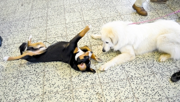 Zľava: Plemeno psa entlebuchský salašnícky pes (Canis familiaris) a pyrenejský horský pes (Canis familiaris) počas Medzinárodnej výstavy psov, ktorá sa koná v dňoch 1. a 2. decembra na výstavisku Agrokomplex v Nitre. Foto: SITA/Martin Havran