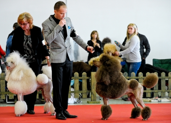 Sprava: Plemeno psa pudel veľký hnedý (Canis familiaris) a pudel veľký biely (Canis familiaris) počas Medzinárodnej výstavy psov, ktorá sa koná v dňoch 1. a 2. decembra na výstavisku Agrokomplex v Nitre. Foto: SITA/Martin Havran