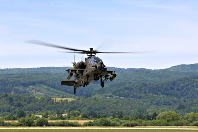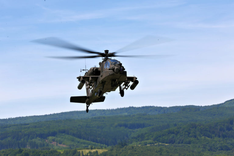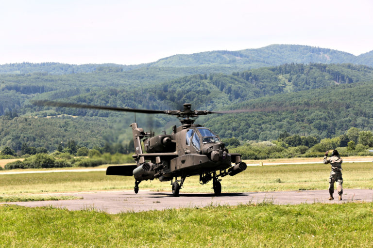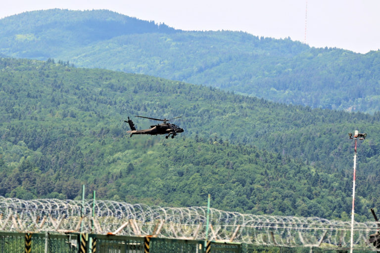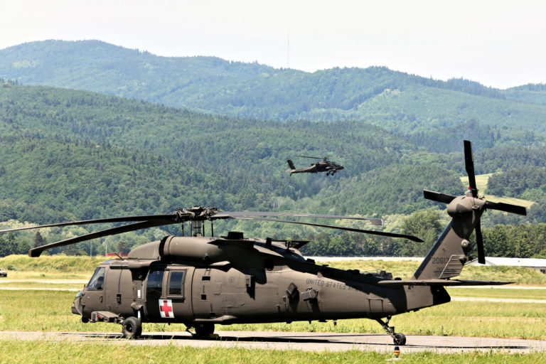 Vrtuľník Black Hawk počas prehliadky vrtuľníkových jednotiek Ozbrojených síl SR a US Army dislokovaných na leteckej základni Sliač v rámci mediálneho dňa pri príležitosti cvičenia Slovenský štít 2021. Sliač, 15. jún 2021. Foto: SITA/Peter Rusko