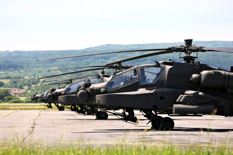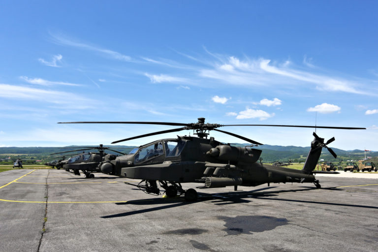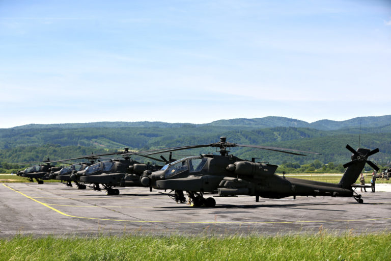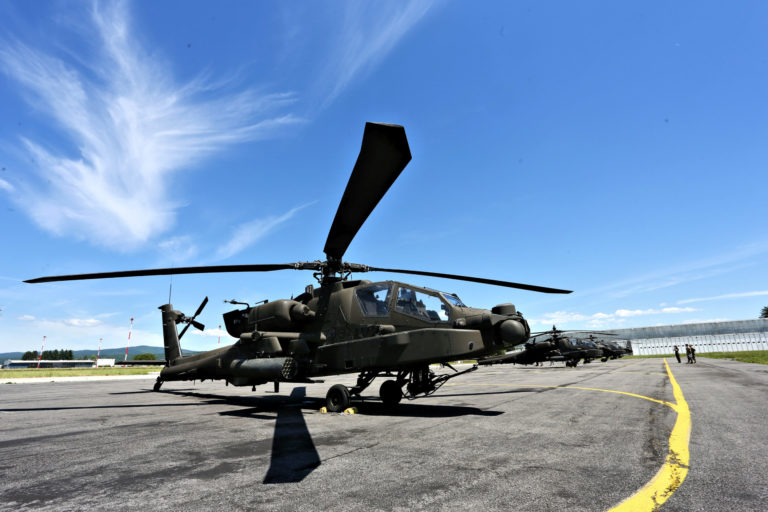 Vrtuľníky Black Hawk počas prehliadky vrtuľníkových jednotiek Ozbrojených síl SR a US Army dislokovaných na leteckej základni Sliač v rámci mediálneho dňa pri príležitosti cvičenia Slovenský štít 2021. Sliač, 15. jún 2021. Foto: SITA/Peter Rusko