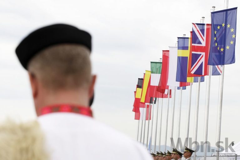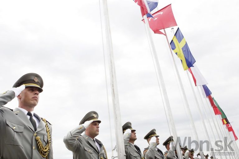Čestná stráž po vztýčení vlajok počas otvorenia Medzinárodných leteckých dní SIAF 2014. Sliač, 30. august 2014. Foto: SITA/Ján Viazanička