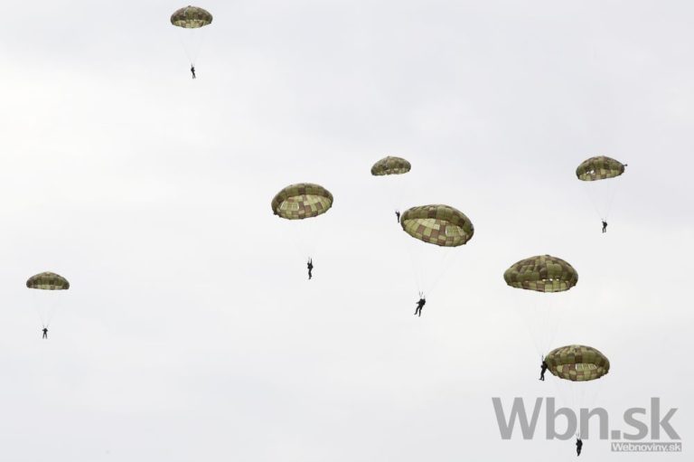 Zoskok parašutistov v rámci predstavenia Retro Sky Team počas otvorenia Medzinárodných leteckých dní SIAF 2014. Foto: SITA/ Ján Viazanička