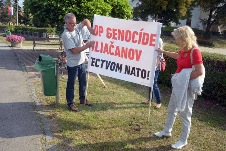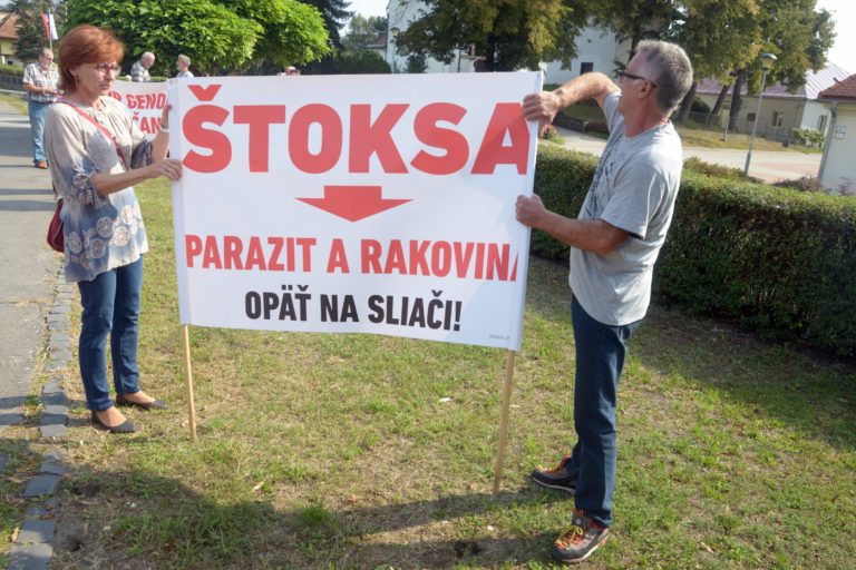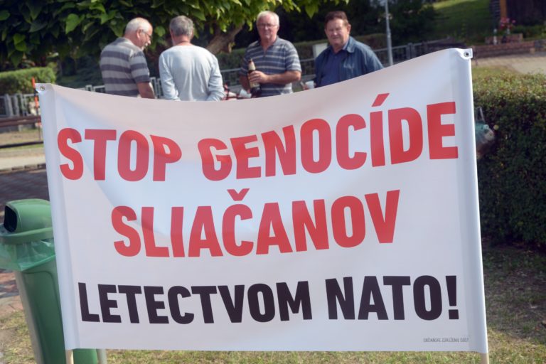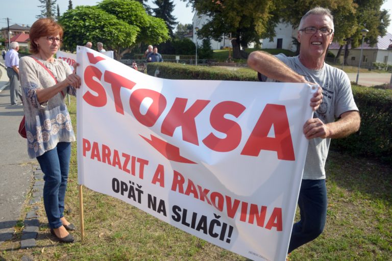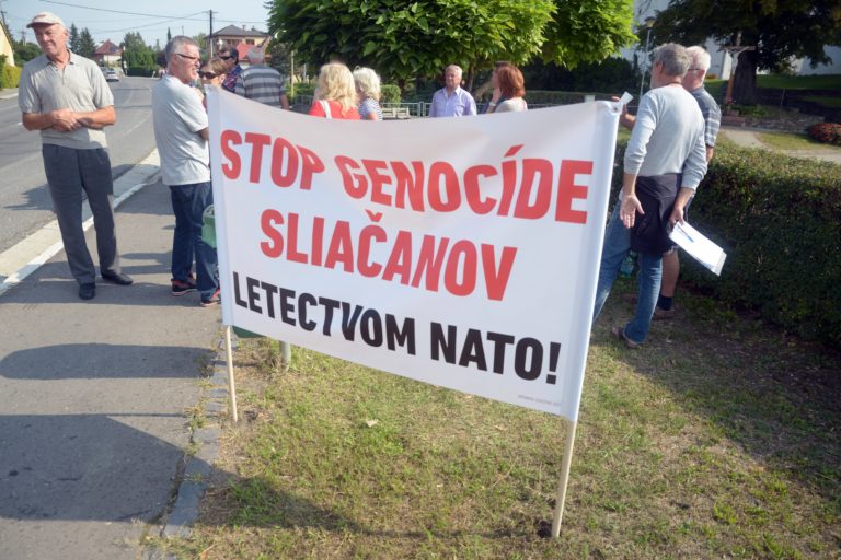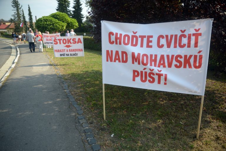Transparenty účastníkov protestnej akcie zameranej proti leteckým dňom SIAF na Sliači. Podujatie organizuje OZ Dosť Sliač, 1. september 2018. Foto: SITA/Jakub Julény