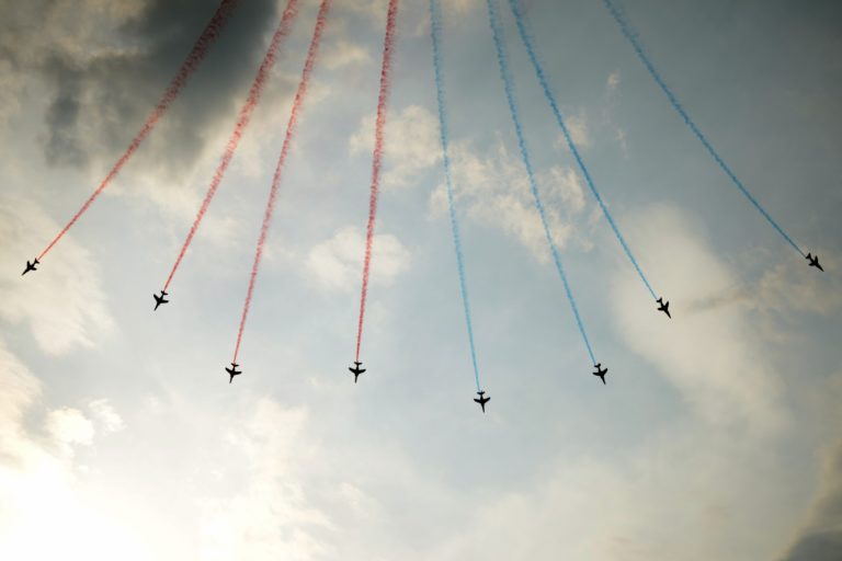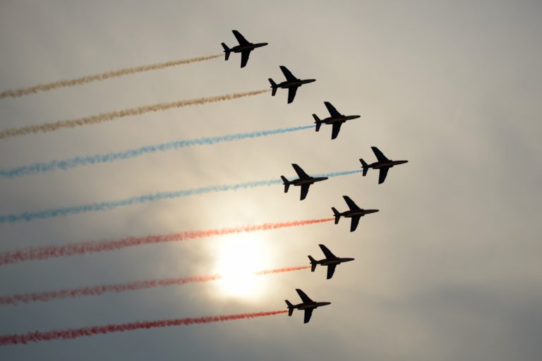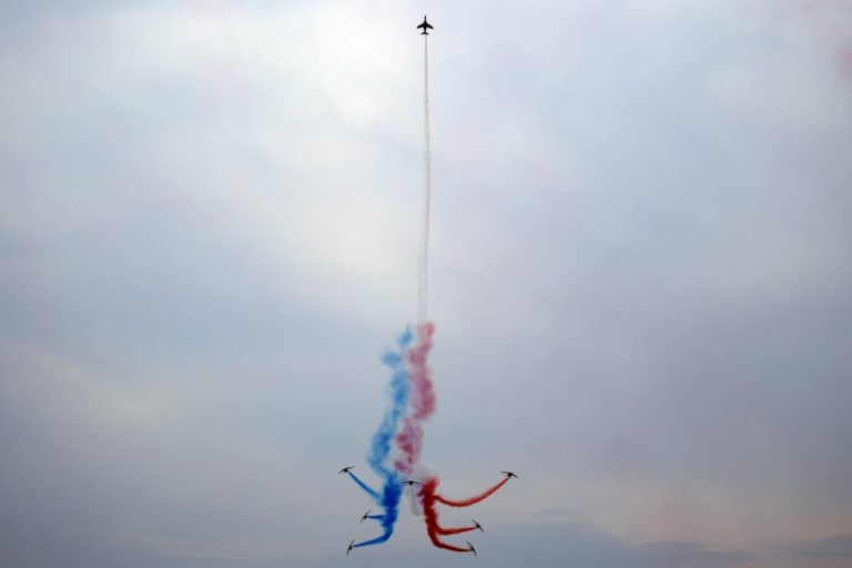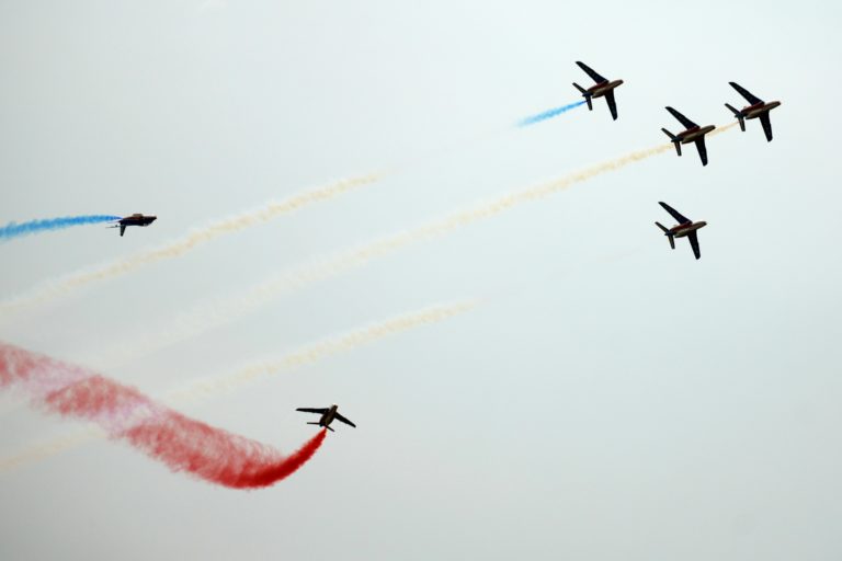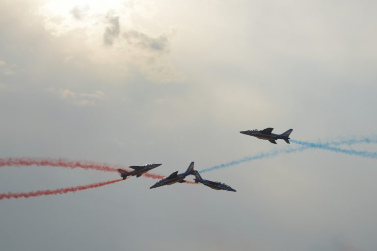 Skupina Patrouille de France z Francúzska na lietadlách typu Dassault/Dornier Alpha Jet počas letovej ukážky v rámci medzinárodných leteckých dní SIAF 2018 na letisku Sliač. Sliač, 1. september 2018. Foto: Archívne, SITA/Jakub Julény.