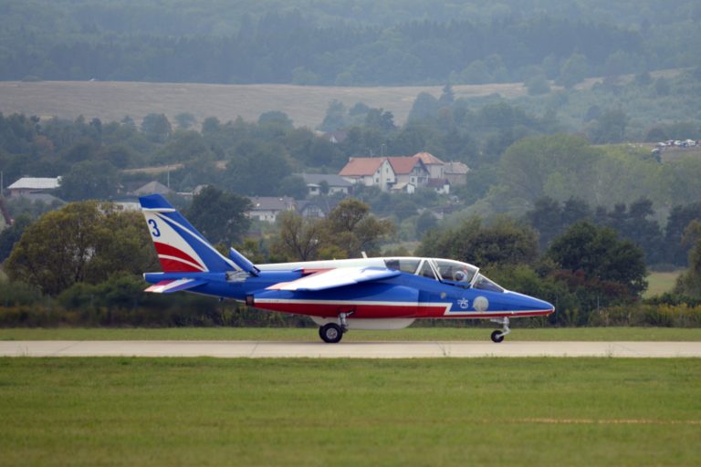Člen skupiny Patrouille de France z Francúzska na lietadlách typu Dassault/Dornier Alpha Jet počas letovej ukážky v rámci medzinárodných leteckých dní SIAF 2018 na letisku Sliač. Sliač, 1. september 2018. Foto: SITA/Jakub Julény.