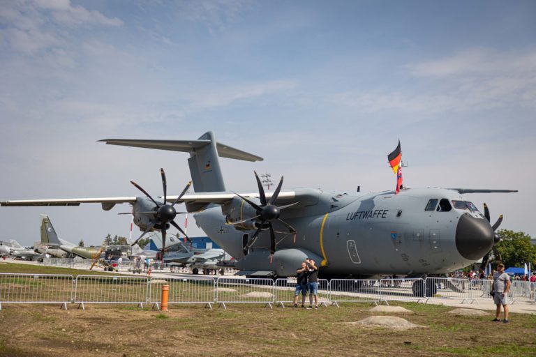Vojenské dopravné lietadlo Airbus A400M počas medzinárodných leteckých dní SIAF 2022 na Leteckej základni Malacky - Kuchyňa. Foto: SITA/Jana Birošová