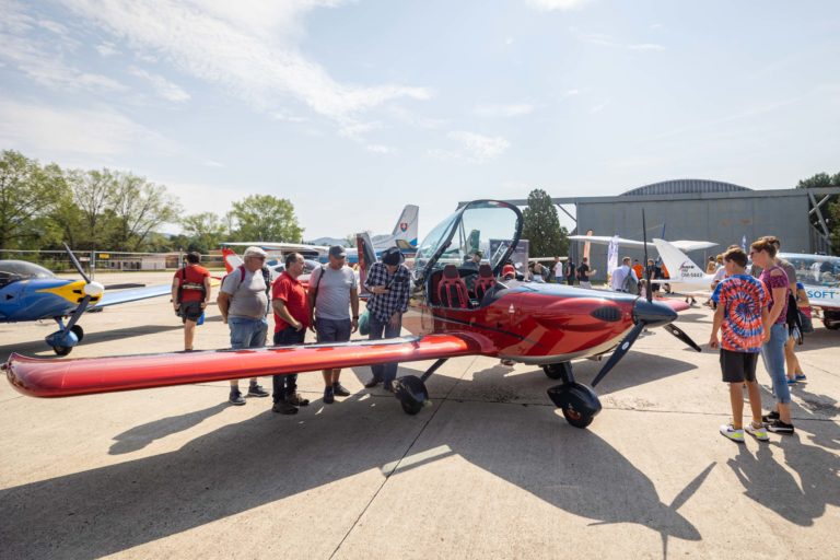 Návštevníci si prezerajú dvojmiestne ultraľahké lietadlo slovenskej výroby Viper SD-4 počas medzinárodných leteckých dní SIAF 2022 na Leteckej základni Malacky - Kuchyňa. Foto: SITA/Jana Birošová