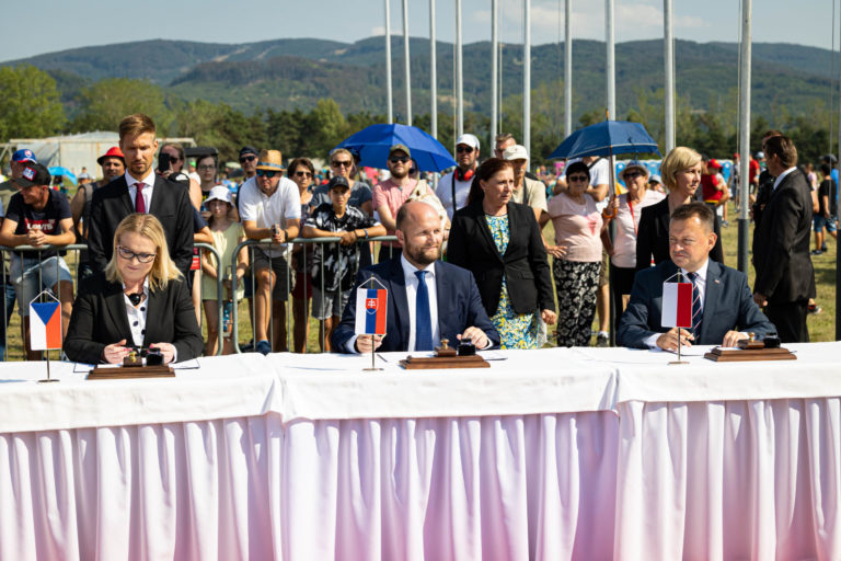 Zľava v popredí: Ministerka obrany Českej republiky Jana Černochová, minister obrany SR Jaroslav Naï a minister národnej obrany Poľskej republiky Mariusz B³aszczak podpisujú Dohodu o ochrane vzdušného priestoru SR v rámci medzinárodných leteckých dní SIAF 2022 na Leteckej základni Malacky - Kuchyňa. Foto: SITA/Jana Birošová
