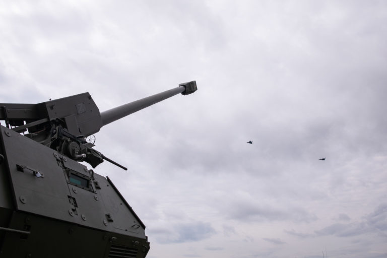 Vojenská technika - Zuzana 2 (vľavo) a lietadlá Eurofighter (vpravo) počas Medzinárodných leteckých dní SIAF 2023 na Leteckej základni Malacky - Kuchyňa. Kuchyňa, 3. september 2022. Foto: SITA/Diana Černak